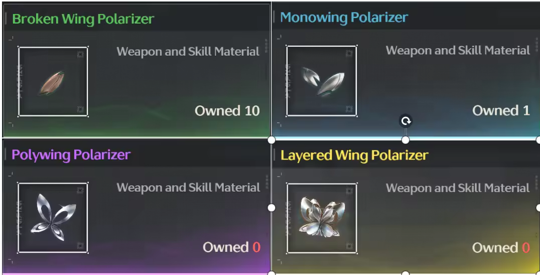 Wing Polarizer: A material used for Weapon Ascension and Skill Upgrade for Sword Resonators. A metallic shard, resembling a pair of butterfly wings, its surface glimmers like Tacetites. Due to its reactive nature, careful storage is required after collection to prevent loss of its frequency energy.