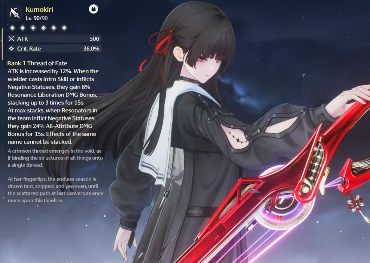 ④ Chisa's preferred weapon is the signature weapon, Kumokiri. Besides that, the signature weapons of Lupa, Augusta, Jinhsi, and Jiyan can also provide damage boosts. The advantage of a permanent 5-star Broadblade is lower compared to the signature weapons of the characters. Of course, if you want to enhance the team, the essential signature weapon is Kumokiri.