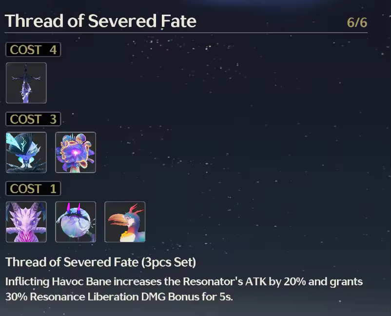 ② For Chisa Echo set recommendations, prioritize the Thread of Severed Fate three-piece set combined with either the Lingering Tunes / Midnight Veil/ Havoc Eclipse two-piece sets. If Resonance efficiency is insufficient, you can start with the Light Clouds Moon Out two-piece set for efficiency. If your technique is lacking, consider equipping the Rejuvenating Glow two-piece set to supplement healing. Note that for Cartethyia and Ciaccona teams, do not equip Chisaki with the Moonlit Clouds five-piece set, as Cartethyia does not benefit from Attack bonuses. A zero-chain Chisa focused purely on defense reduction and healing can use the Rejuvenating Glow five-piece set.