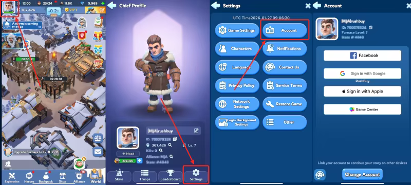 - At present, our Whiteout Survival login in top up method only supports Google and Facebook. If you registered your Whiteout Survival account through other channels, we recommend you to follow the following steps below to link your Google or Facebook account so that we can complete the top up process.