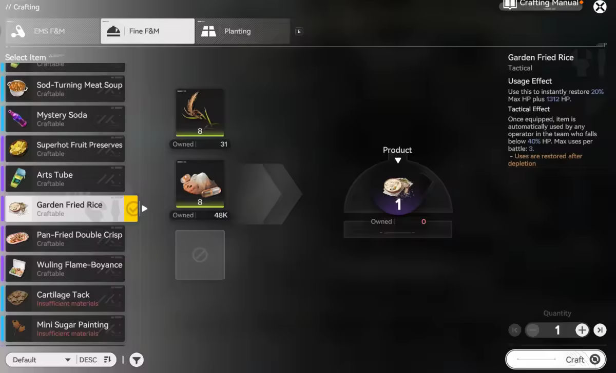 Garden Fried Rice = Amber Rice + Yazhen Powder (Restores 20% Max HP + 1312 Fixed HP)