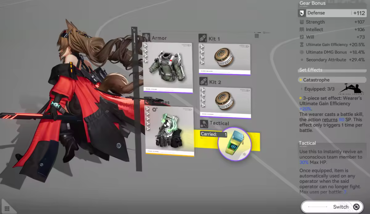 The cutting-edge technology lies in Gilberta and Akekuri carrying the 3-piece Catastrophe set; the two Catastrophes can provide an additional 100 SP, allowing Laevatain to seamlessly chain an enhanced battle skill, saving time.