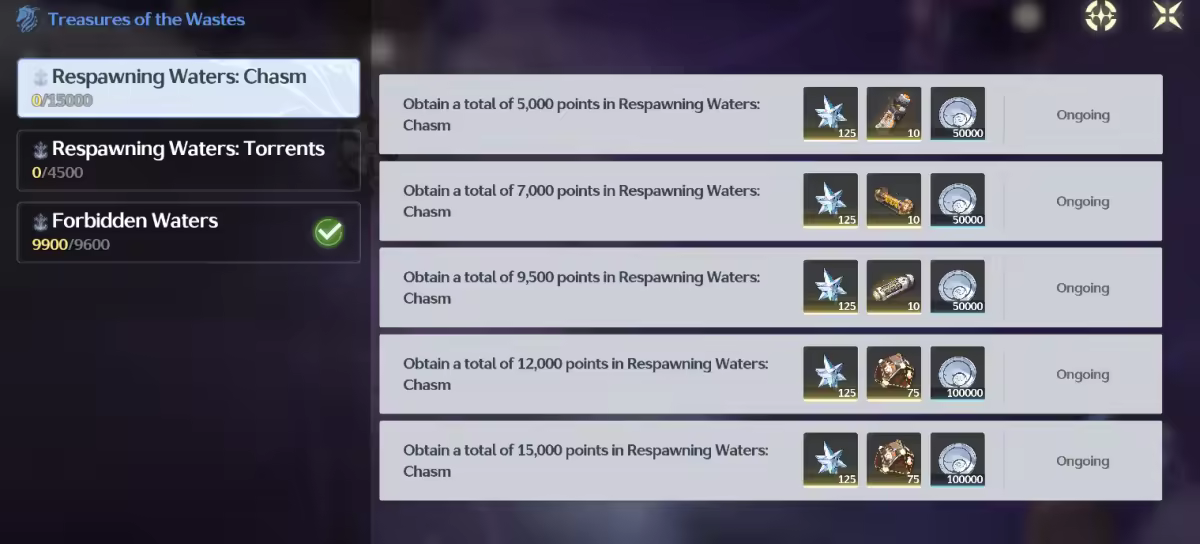 - Reset the completion progress of the three tasks in Whimpering Wastes mission under "The Sea Ruins Hide and Seek": "Accumulate 6,400 points in The Forbidden Sea," "Accumulate 8,000 points in The Forbidden Sea," and "Accumulate 9,600 points in The Forbidden Sea."